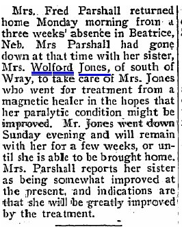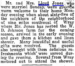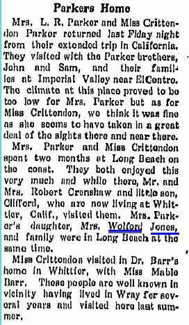1910 Wray "Frank and Hubert Jones are staying at the home of their grandmother, Mrs. L. R. Parker in order that they may take advantage of the school here. Frank entered the third grade and Hubert the seventh."