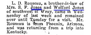 1908 Phoenix, Arizona "Dr. J. W. Rousseau from Somerset, Kentucky, is a guest of his brother L. V. Rousseau, of the Cartwright district."