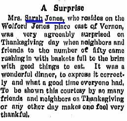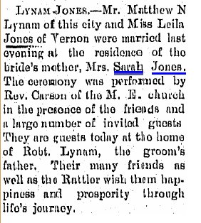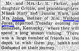August 1917 "Mrs. Sarah Jones and son Sam, and Mrs. Leila Lynam, left last Tuesday evening for an extended visit at their former home in Kentucky."