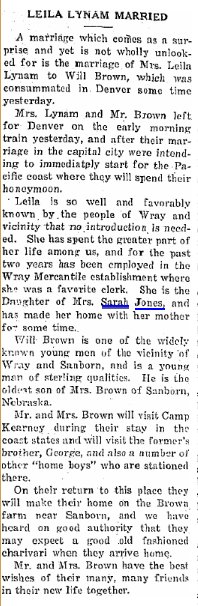 May 1917 "Master Royal Lynam is suffering with an attack of the measles this week. His grndmother, Mrs. Sarah Jones of nine miles southeast of Wray is in town taking care of him during his illness."
