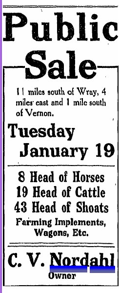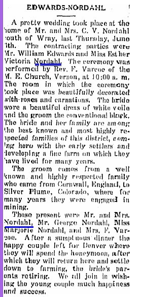 1912 Miss Esther Nordahl began teaching in the Columbia district south of Wray. "Miss Nordahl is a graduate of the 1912 class."