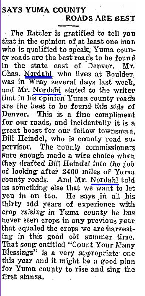 1916 C.V. Nordahl left by auto Tuesday for Denver, Colorado Springs and other mountain points. They will also go to Aspen where Miss Esther Nordahl will teach the coming year."