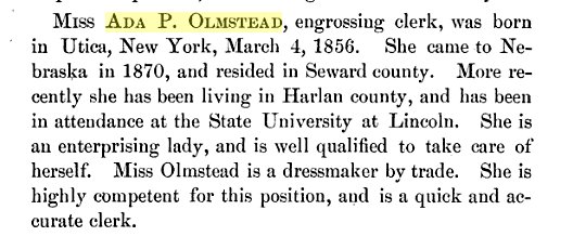 February 22, 1888 "Miss Ada P. Olmstead, who was engrossing clerk of the senate at the last session,