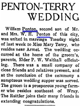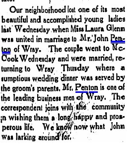 December 1915 "On last Sunday, Rev. A.W. Rice performed the ceremony uniting the lives of C.C. Cumley and Miss Sadie Penton, both of Wray. These young people are well known in Wray."