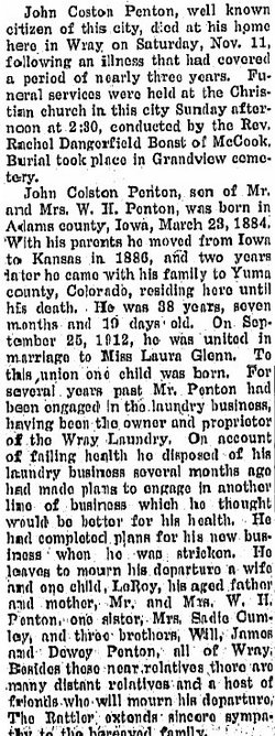 William 1859-1940 is buried in Wray , with Laura Leah (Weller) Penton 1861-1937.