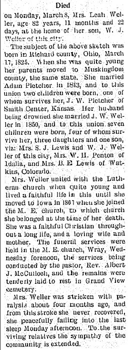 J. W. Weller was born in Morgan County, Ohio, March 3, 1825, and died in Wray at the home of his daughter, Mrs. S. J. Lewis, October 4, 1907. He was married to Mrs. Leah Pletcher in 1849 and removed to Iowa in 1868 and thence to Colorado in 1888.