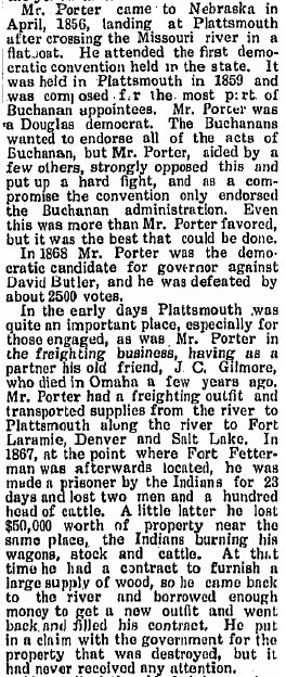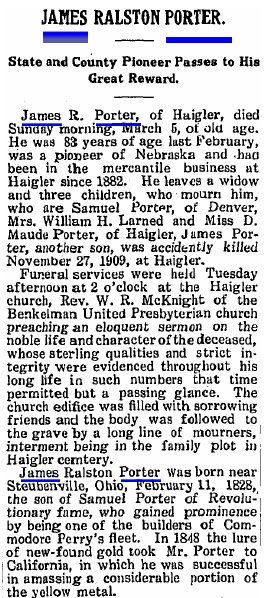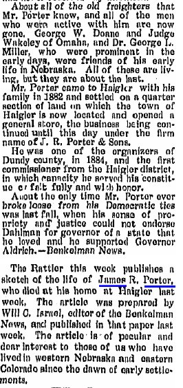 It's possible that this is a relative of James R. Porter, a well-known merchant in Wray and Haigler, who cash-claimed and timber-claimed land near Haigler in 1890 and 1892.