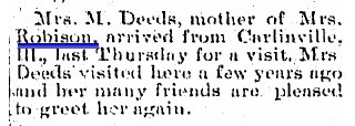 THOMAS MARSHALL ROBISON, whose demise occurred at Wray, Colorado, on the 1st of February, 1897, was a worthy native son of Macoupin county and was for some time engaged in the drug business at Chesterfield. His birth occurred near Greenfield, Barr township, this county, on the 11th of December, 1855, his parents being Presley and Elizabeth (Redmond) Robison, who were natives of Kentucky and Indiana respectively. The father, an agriculturist by occupation, took up his abode among the pioneer settlers of Barr township, entering a trace of land from the government. His demise occurred thereon when he had attained the age of sixty-six years. His wife passed away in Hettick at the age of about seventy-three. Unto them were born seven children, as follows: William, who is a resident of Tacoma, Washington; George E., living in Barr Township; "Doc," of Carlinville; James, who is deceased; Thomas Marshall, of this review; Lona, who gave her hand in marriage to Thomas Overby; and Belle, the wife of Charles Nelson. Thomas M. Robison remained on the home farm in Macoupin county until he had attained the age of nineteen years and then followed the profession of teaching for several years. Subsequently he embarked in the drug business at Chesterfield in association with A. A. Gary. Removing to Colorado, he there took up a homestead and later went into the grain business at Wray, that state. There he continued to reside until called to his final rest on the 1st of February, 1897. On the 6th of October, 1886, Mr. Robinson was joined in wedlock to Miss Mary E. Deeds, who was born near old Zanesville, in Montgomery county, Illinois, on the 3d of October, 1865, her parents being David and Mary A. (Bird) Deeds. Her paternal grandparents were Philip and Anna (Metcalf) Deeds, while her maternal grandparents were William and Mary (Stuart) Bird. David Deeds, the father of Mrs. Robison, was born near Carrollton, Greene county, Illinois, on the 22d of April, 1832, but spent the greater part of his life in Macoupin county. For a few years he made his home in Montgomery county. His demise occurred in Bird township, Macoupin county on the 27th of April, 1875, when he had attained the age of forty-three years. His wife, whose birth occurred near Pittsburg, Pennsylvania, on the 5th of May, 1833, still survives him and makes her home in Carlinville. They were the parents of eleven children, as follows: Elra P., who is deceased; William A.; Horace D.; George Edgar; Anna Belle; Mary E.; Joseph B.; Ernest L.; Charles F.; and two who died in early life. Unto Mr. and Mrs. Robison were born five children. E. Juanita is a graduate of the Carlinville high school and Blackburn University and also pursued a post-graduate course in the University of Illinois, winning the degree of Bachelor of Arts from the last named institution. She is now principal of the high school at White Hall, Illinois. Victor Blaine, who is likewise a graduate of the Carlinville high school and Blackburn University and did post-graduate work at the University of Illinois, now acts as traveling salesman for Meyer Brothers' coffee house of St. Louis. Clarence E., is a painter by trade. Helen Robison died in infancy and Mary is a high school student. Mr. Robison was a worthy exemplar of the Masonic fraternity, belonging to the Greenfield and Chesterfield lodges. He took a deep and helpful interest in the work of the Methodist Episcopal church, to which his widow also belongs. The latter makes her home at No. 520 North Seminary avenue in Carlinville. |