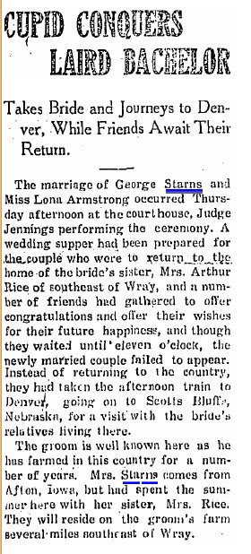 1923 "John Starns and sister Nellie motored to the home of their parents south of Laird last Sunday and spent the day. Other guests at the Starns home were Mr. and Mrs. Sample and Dson Dewey."