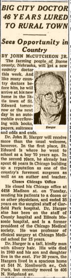 1956 " Dr. John R. Harger, 79, physician and surgeon who was born at St. Edward, practiced in Chicago for many years and returned to practice at St. Edward, died at Alliance, 0 . Dr. Harger had practiced in Chicago for 46 years, gaming prominence as a surgeon. In 1950, he decided to leave the 'turmoil of the city' and returned to practice at St. Edward.