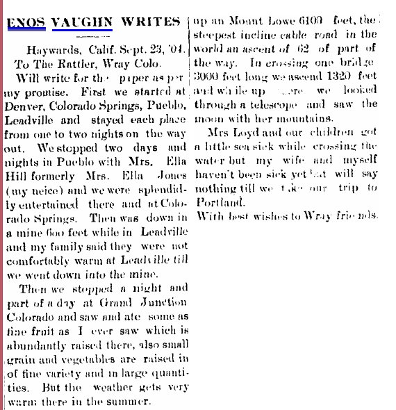 July 1901 Wray "Grandma and E.H. Vaughn left yesterday for Manitou." (Manitou Springs, near Colorado Springs0