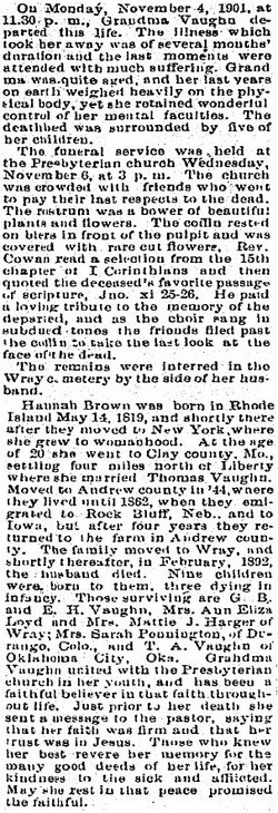 In 1880 Stewartsville, Dekalb County, Missouri, Thos Vaughn is farming, 71, Hannah W. 61, Mattie 26, and grandson Georgie Vaughn 12..