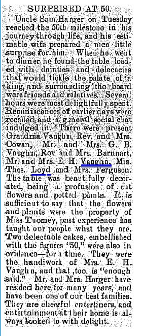 1901 "Mesdames S. P. Hargar, G.B. Vaughn, F. Lloyd, E.H. Vaughn, and Mrs. Pennington of Durango were the gusts of Mr. and Mrs. Pike Tuesay."