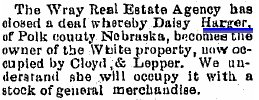 1903 "Miss Daisy Harger of Osceola, Nebr., daughter of S.P. Harger of this city for a visit last Friday. Miss Daisy will probably accompany Mr. and Mrs. Harger on their trip west in the near future."