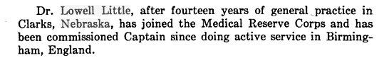 On his return, he helped plan the new Boone County Memorial Hospital at Albion and served as its chief of staff. In 1954, he suffered a heart attack and retired. He died at the home of his daughter, Mrs. Cecil Stewart of .Alliance, 0. Surviving besides his daughter are a son, James H. of Ridgwood. N. J., and a nephew, Robert H. Clapp of Lincoln. "