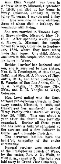 Ann Eliza (Vaughn) Loyd # 81588849 is buried in Wray.