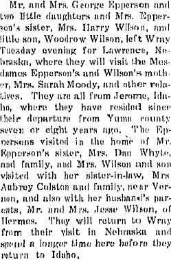 1901 Wray "Mr. and Mrs. Sam Lewis and children who have been visiting the Armstrong and Whyte families returned to their home at Creston, Ia., Monday. TEhey were well pleased with their visit here."
