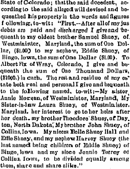 1914 "Mr. and Mrs. J.W. Shuey of Collins Iowa arrived in Wray in the settlement of the Alex Shuey estate. Mr. Shuey is a brother."
