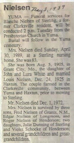 Blanche White and Louis E.M. Nielson married in Yuma County on December 24, 1925.