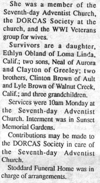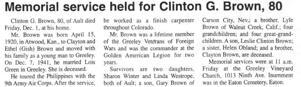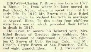 Clayton P. Brown # 58633882 has buried in Eaton Colorado - age 78 dying 1955 with Rosa Ethel dying 1975 at age 83 # 58633918.