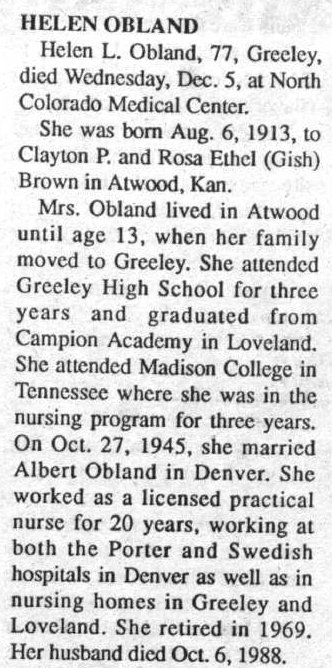 1916 "Mr. and Mrs. Clayton Brown and family returned to their home at Atwood, Kansas this morning after spending several days at the home of his sister, Mrs. Ivan Dickenson." So Dollie was a Brown....
