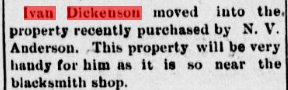 1912 "Iva (sic) Dickenson will hold his sale the 23rd of this month. He intends to leave for his new home in Nebr. about the 1st of February. We wish him all good luck in his new home."