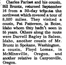 1967 "The Donald Crones of Garden City Kansas spent the week end at the Robert Pariset home. Mrs. Crone and Mrs. Pariset are sisters."
