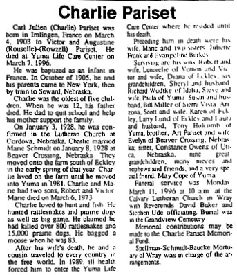 Charles Julien Pariset was born March 4, 1903 in Imlingen, France to Victor J. Pariset and Augustine C. Pausselle, dying March 7, 1996.