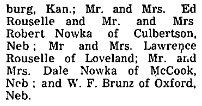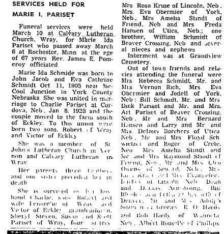 July 1969 "Mr. and Mrs. Charles Pariset went to Culbertson, Nebraska to attend the funeral of Mrs. Alice Nowka. She was a cousin to Mr. Pariset."