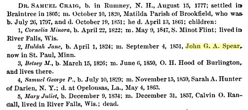 John married Huldah Jane Craig Sep 4, 1851, in Braintree, Vermont.
