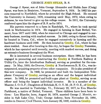 1897 "Geo Spear, of Greeley, was in Brighton on business again the last of the week."