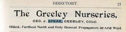 In 1896 Denver, John G. A. Spear is a nurseryman, living at # 5, 1935 Larimer Street.