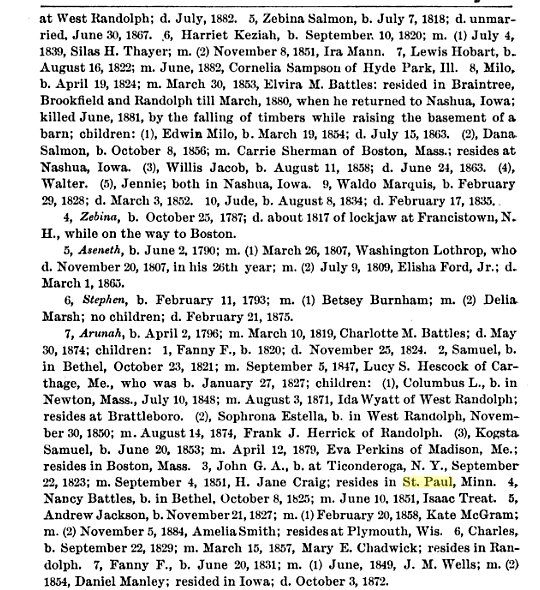 In 1850 Braintree, Arunah is 54, Charlotte 55, John G. A. 25, Nancy B. 23, Andrew J. 22, Charles 21, Fanny Wells 18, Susan Buttler (probably Battles) 98, and Isaac Treat 35.