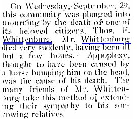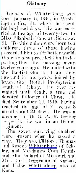 October 1915 "Mrs. James Ballard who was called here by the sudden death of her father T.F. Whittenburg returned to her home at Norborne Missouri, Wednesday."