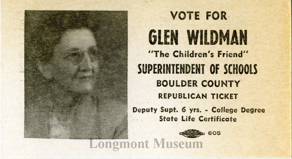 Glenn R Wildman is listed as Boulder County School Superintendant in Polk 1949 and 1953