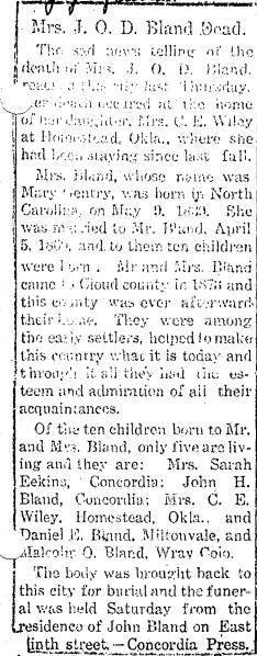 June 2, 1904 Concordia " Born, to Mr. and Mrs Malcolm Bland, a daughter."
