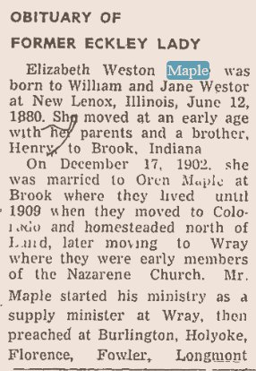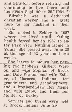 "Mrs. Elizabeth Weston Maple, 92, formerly of Brook, died at 8 p.m. Monday in Yuma Nursing Home, Yuma, Colo., where she had been a patient five and half years.