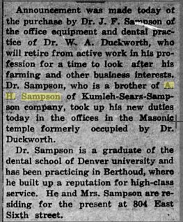 Son of Julius' half-brother November 25, 1907 Salina Kansas. News was received here this morning of the death of William B. Sampson, which occurred Saturday, November 16, in Tacoma, Wash., at the home of his aunt, Mrs. May Sampson Guyles. A letter from Mrs. Guyles, who is a sister of M. D. Sampson, was received here today giving the particulars of the lingering illness and death. Will Sampson went to Skagway, Alaska, in October, 1896, to become postmaster at that place, the appointment being made by J. L. Bristow, then fourth assistant postmaster general. At that time the post office was a fourth class one. ; The work was exceptionally heavy, as all mail. going into the Klondike passed through there. Will did the work of three men, often times never leaving the office during the night, but snatching an hour or two of sleep on a pile of mail sacks. In this, way he became in bad physical condition, and when the epidemic of spinal meningitis broke out in Skagway, fell an easy victim. The first reports of his illness were sent to his parents, Mr. and Mrs. M. D. Sampson of Salina, saying that he was dead. A week later another message was received saying that he was still alive, but in a critical condition. His mother went to Alaska immediately and nursed him through his sickness, which left him an invalid. In spite of this, where he was able he kept at his work and for over eleven years has held his position. For the past few years he has been in such physical condition that he was compelled to go to and from his work in a wheel chair, and in many respects has been helpless. The post office has grown from a fourth class to a second 'class' one, and Mr. Sampson has carried on the work without a stop until this summer, when he be came worse. Last May his mother went to Skagway, and although in a feeble condition Will continued going to the office throughout the months of July and August. Finally he was confined to the house and in October was forced to send in his resignation. Preparations were then made to go to Tacoma, which place was reached November 10. From that time on his sufferings became worse and he failed rapidly, death occurring six days after arriving at the home of his aunt. His father, M. D. Sampson, who is in Reno, Nev., was unable to reach his bedside before death came. He was buried in a Tacoma cemetery by the side of his uncle, ?? E. Sampson, formerly of Salina. Will Sampson was born in Salina thirty-two years ago and was the oldest son of Mr. and Mrs. M. D. Sampson, who have been away from Salina about five years. He graduated from the Kansas Wesleyan university and later attended the state university. He was a born naturalist and when a boy his workshop and room showed some good specimens of his work. He was young when he went to Skagway to take up his new duties, and was equal to all the calls made upon him in the rush of the gold seekers. He was an exceptionally strong man physically and his invalidism, which was painful in the extreme, was a test which brought out the strong points in his character. Although he had been in Alaska for the past eleven years, Mr. Sampson is well remembered by his Salina friends. His mother will remain in Tacoma for a short time, after which she will go to Salt Lake City. Lieutenant Charles L. Sampson of the United States army, and his sister, Miss Edith Sampson, who have been in the Philippines for the past year or so, will arrive in San Francisco December 5 on their way to Salt Lake City, where Lieutenant Sampson's regiment has been assigned. M: D. Sampson will remain in Reno, Nev. : Mason D. Sampson Jr., cashier of the Solomon State bank, is a brother of the deceased. |