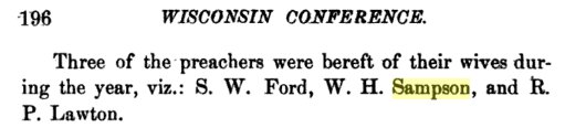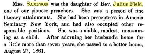 REV. JULIUS FIELD, son of Ichabod and Anna (French), b. in East Guilford, Conn., April 2, 1799. He entered the Methodist ministry, and was licensed to preach in 1820. He was first stationed in New York City; in 1827 at Glenn's Falls, N. Y. ; in 1829 at Fort Ann, N. Y. ; in 1832 at Salisbury, Conn. ; in 1834 at Sylvianna, Wis., and at various other places during his long ministry. He resided at Durham, Conn. He m. May 4, 1824, Minerva S., dau. of Helmor Kellogg, of Goshen, Conn., b. Sept. 24, 1800; d. Dec. 23, 1875. He d. Sept. 1884. i. SUSAN MINERVA, b. May 7, 1827; m. Jan. 2, 1855. Rev. William H. Sampson, of Appleton, Wis. ; d. Aug. 27, 1861. , 3680. ii. JULIA ANN, b. Jan. 15, 1829; m. Dec. 30, 1858, Rev. Hiram P. Shephard, of Belleville, U. C. W. ; d. Dec. ao, 1863.^ iii. JANE AUGUSTA, b Jan. 7, 1832; m. Aug. 30. 1860. Samuel S. Scranton, of Durham, Conn. She d. June, 1888. Susan Minerva Field, born May 7, 1827 in New York City, was the daughter of Rev. Julius Field, a Methodist Mminister 1. She married Wm H. Sampson at Appleotn on January 2, 1855, and died August 27, 1861. |