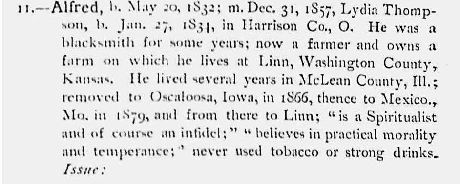 In 1900 Alfred is a farmer in Washington County, Kansas, born May 1832,