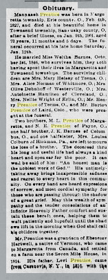 In 1870 Sandusky County, Ohio, "Manarsa" and Weltha Prentice are both 43, Alice 16, Henry 14, Fanny 12, Burton 10, Olive 5, and Nellie 2.
