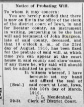 She was Ida Blanche Brooks in Torrington, Wyoming in 1942, saying that John LeRoy Sturgeon was born July 26, 1903 in Pleasanton, Decatur County, Iowa to John Henry Sturgeon of Kentucky.