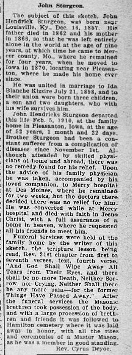 John H. Sturgeon, 53, died February 5, 1910, buried in Decatur County.
