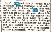 1938 Yuma "Mr. and Mrs. Ray Coy and daughter of Lincoln, Nebraska came in to visit Roy's father L. H. Coy."