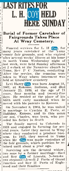 1934 "L. H. Coy of Yuma was a Wray visitor on Tuesday of this week"