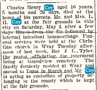 James Harvey Coy was born August 27, 1883 at Council Grove to William L. Coy and Maggie Robinson.