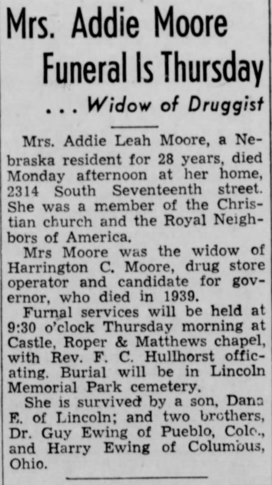 "Word was received Wednesday afternoon of the death of John P. Ewing, formerly of Lincoln at the home of his son, Prof. H. W. Ewing Delaware, Ohio. The body will be brought to Lincoln for burial. "