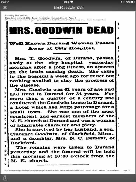 Addie L. Goodwin, 18, daughter of Theo Godwin and Caroline Carey, married Nahum C. Besment in Winnebago County on April 7, 1885.