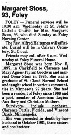and Mrs. Margaret Stoss of Harris, Minn., and one granddaughter."