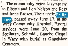 two brothers, Fred and Phillip of Wray, besides a host of other relatives and friends. He was a loving husband, and father, so patient in his suffering, and will be missed by all who knew him. He was anxious to leave this world of suffering and sorrow, knowing there is a home for him eternal in the heavens whose builder and maker is God. Funeral services were held Wednesday afternoon at 2 o’clock at the Hitchcock Funeral Home. Rev. Zora Getchell was in charge of the services, with Legion services at the grave.
